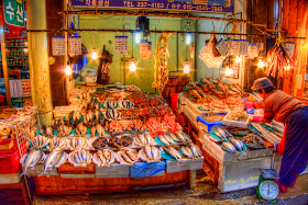 ひしめき、アジョッシ、アジュンマ(おじさん、おばさん)が買い物をしています。